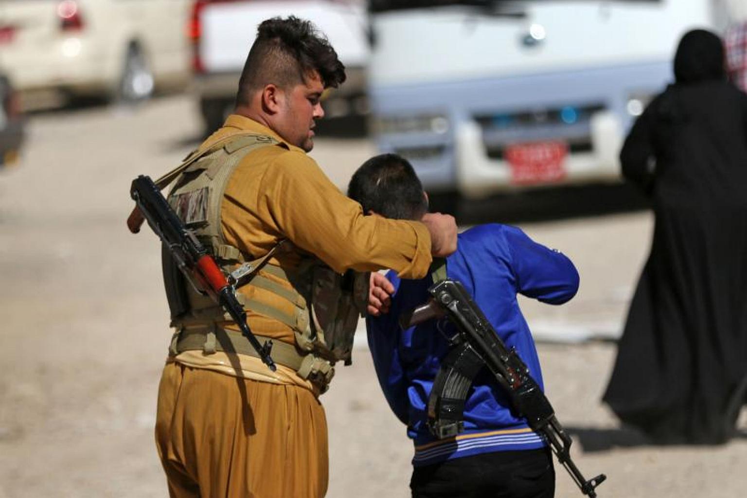 A member of the Iraqi Kurdish forces straps a kalashnikov riffle on the back of a youth at an unfinished housing project where displaced people fleeing violence in the northern Kirkuk province are taking shelter on Oct 19, 2017 in Arbil, the capital of the autonomous Kurdish region of northern Iraq.