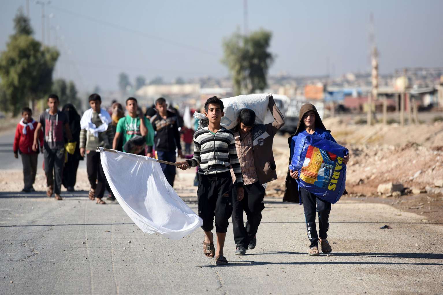An Iraqi youth, who fled the violence due to the ongoing operation by Iraqi forces against the Islamic State in Iraq and Syria to retake the city of Mosul, walks with a white flag on Nov 3, 2016 as people leave Gogjali, Mosul.
