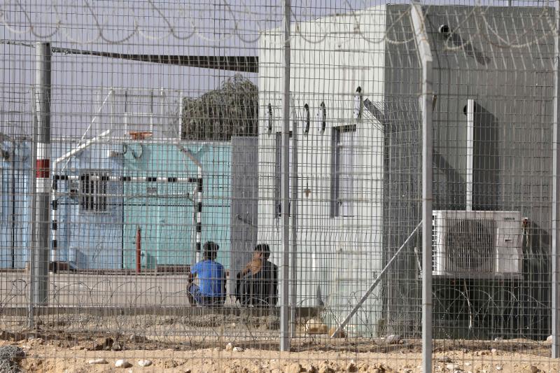 Detained African migrants sitting inside the Holot detention centre, located in Israel's southern Negev desert on Feb 4, 2018.