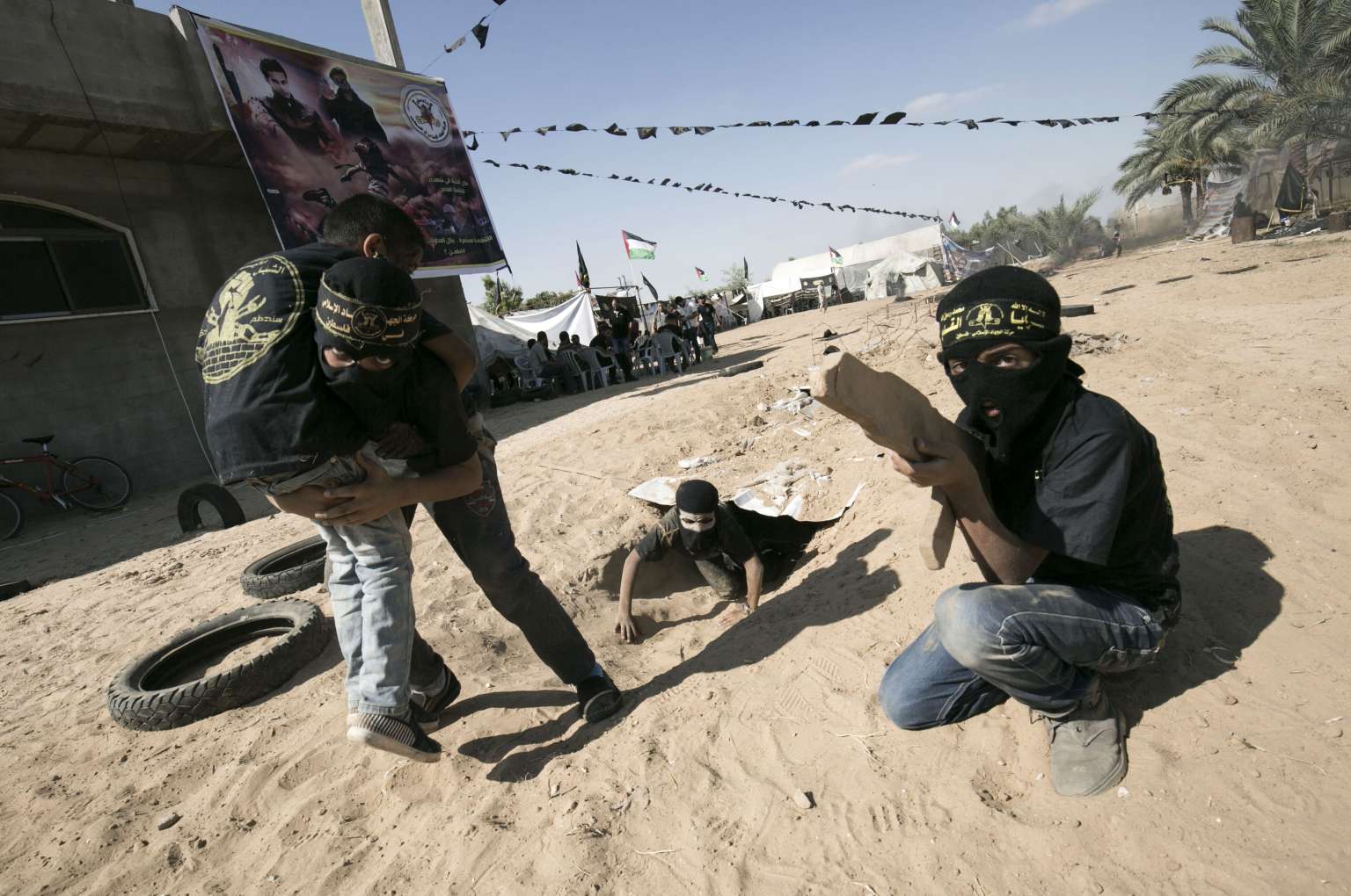 Young Palestinians pretend to kidnap a soldier during a military-style exercise at a summer camp organised by the Islamic Jihad movement in Khan Yunis in the southern Gaza Strip, during the youngsters' summer school vacation, on July 14, 2016. Hundreds of youngsters between the age of six and 16 can participate, and receive military as well as religious training.