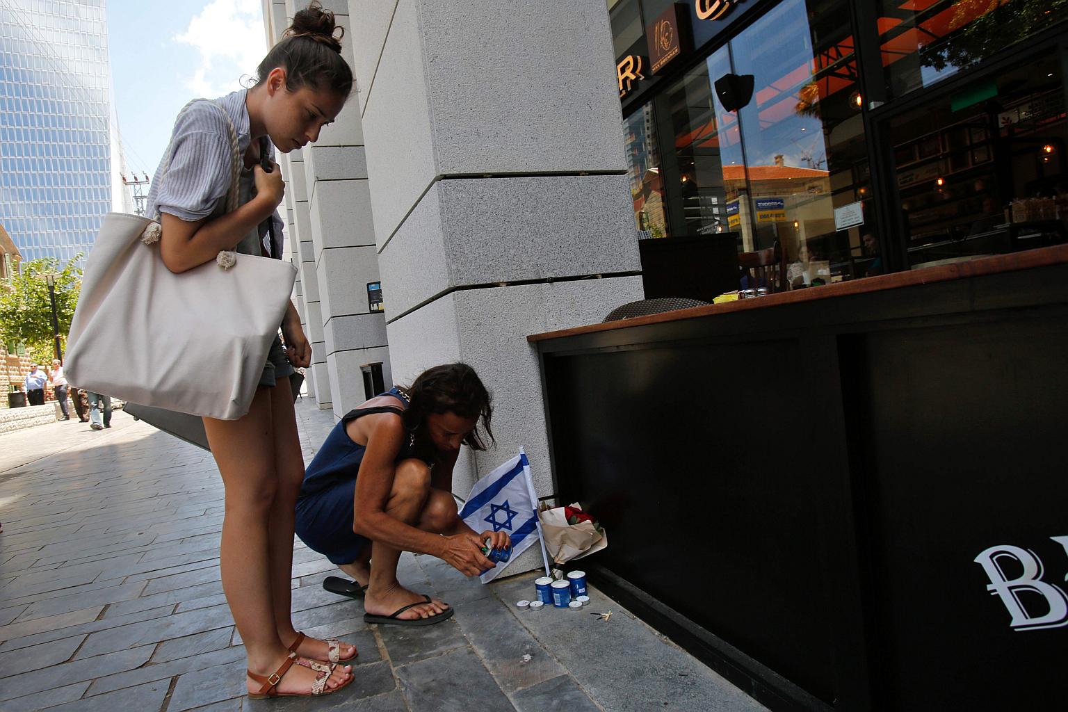 Israeli passers-by light candles on June 9 next to the restaurant that was targeted in the shooting attack in Tel Aviv.