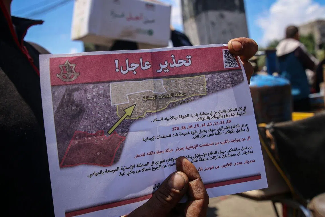 A Palestinian showing a leaflet dropped on May 6 by Israeli aircraft warning them to evacuate ahead of military operations in Rafah.