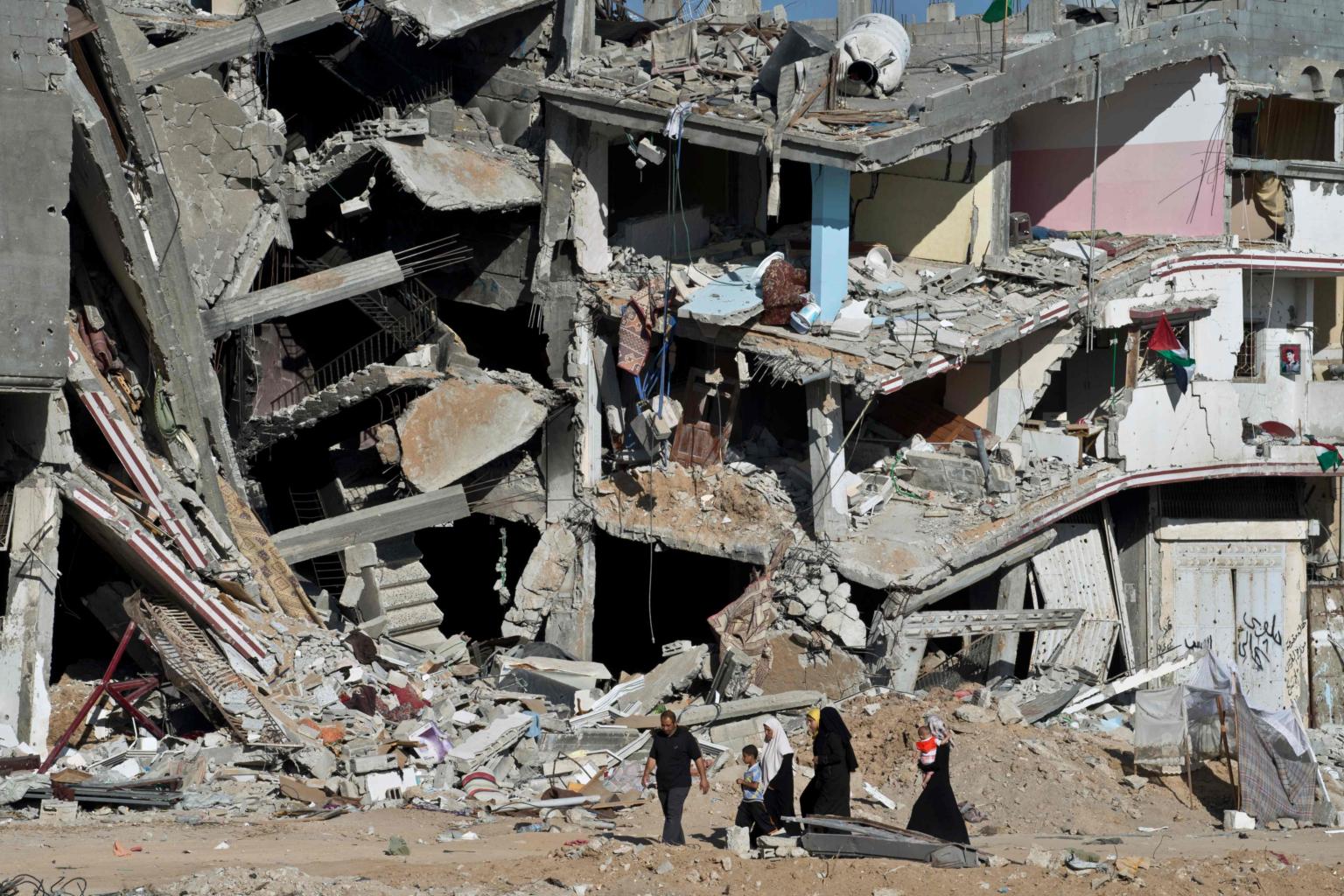 In a photo taken on Aug 27, 2014, a Palestinian family walks past the collapsed remains of a building that was destroyed in fighting between Hamas militants and Israel.