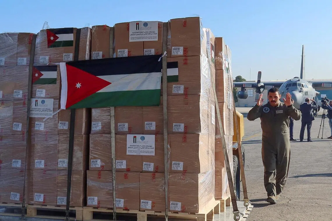 Humanitarian aid and supplies from the Jordan Hashemite Charity Organisation in Amman on Oct 12, 2023, destined for Gaza.
