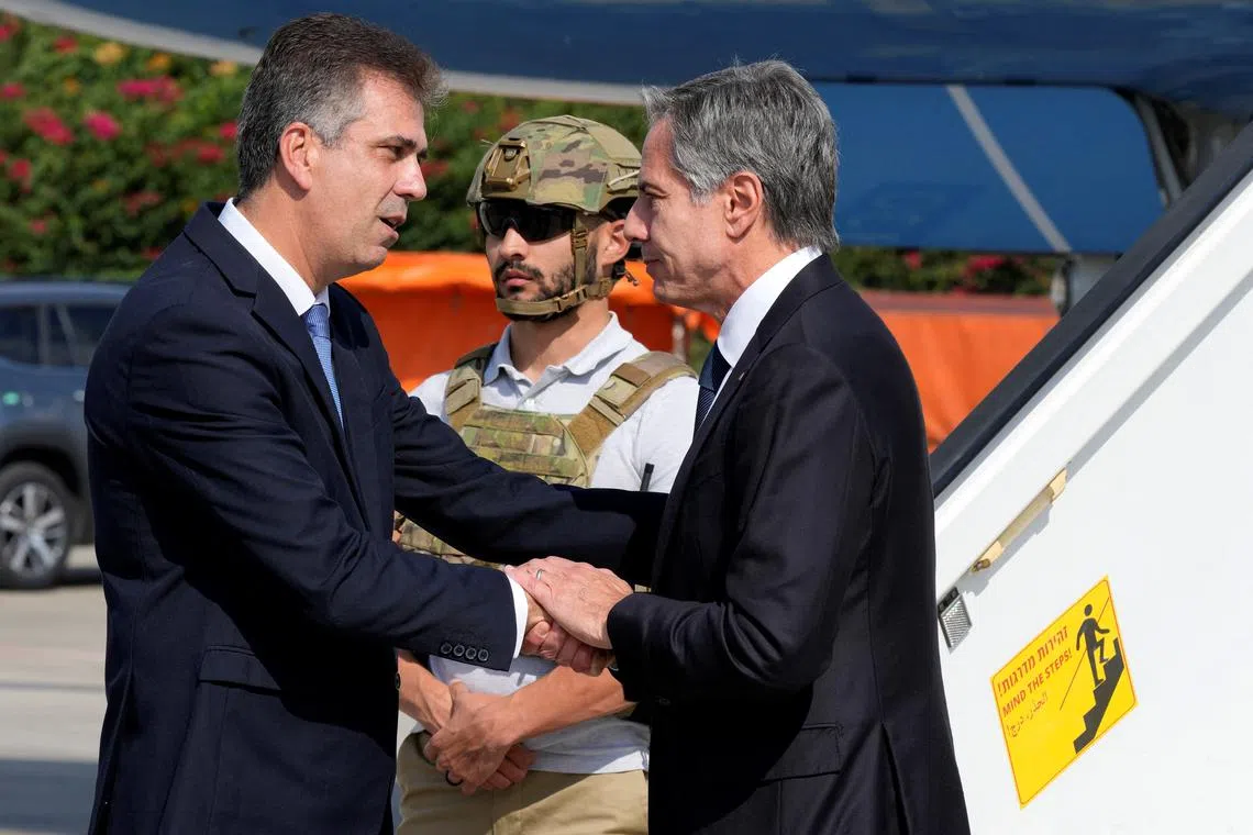 Israel’s Foreign Minister Eli Cohen (left) welcoming US Secretary of State Antony Blinken at Ben Gurion Airport in Tel Aviv, Israel, on Oct 12.