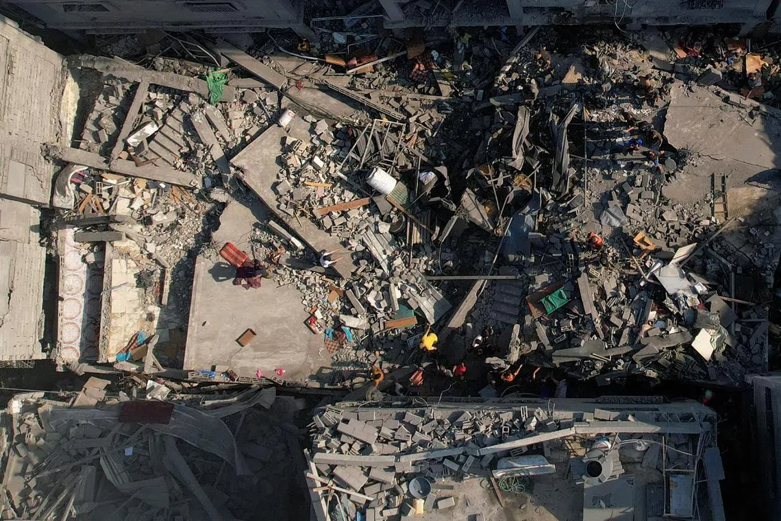 Ruins of Palestinian houses hit by Israeli strikes at the Al-Shati (Beach) refugee camp in Gaza City on Oct 12, 2023.