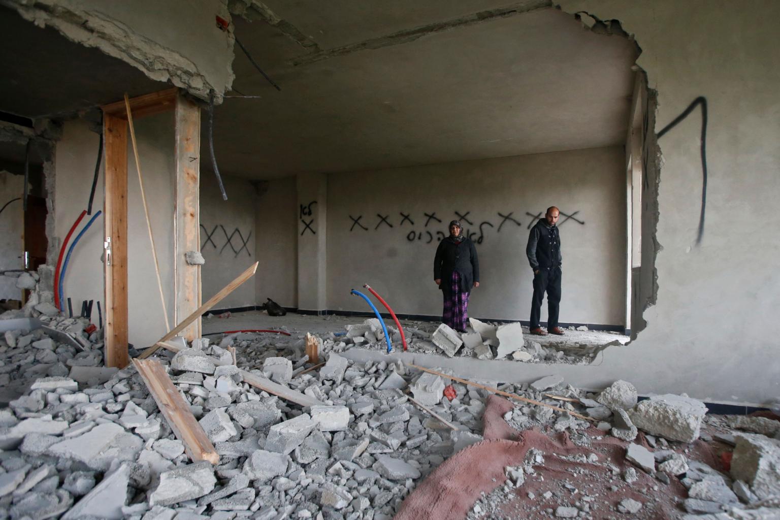 The parents of Arafat Irfaiya, a 29-year-old Palestinian accused of killing a young Israeli woman last February, stand inside their damaged home after an Israeli army bulldoser destroyed it in the Israeli-occupied West Bank town of Hebron, on April 19, 2019.