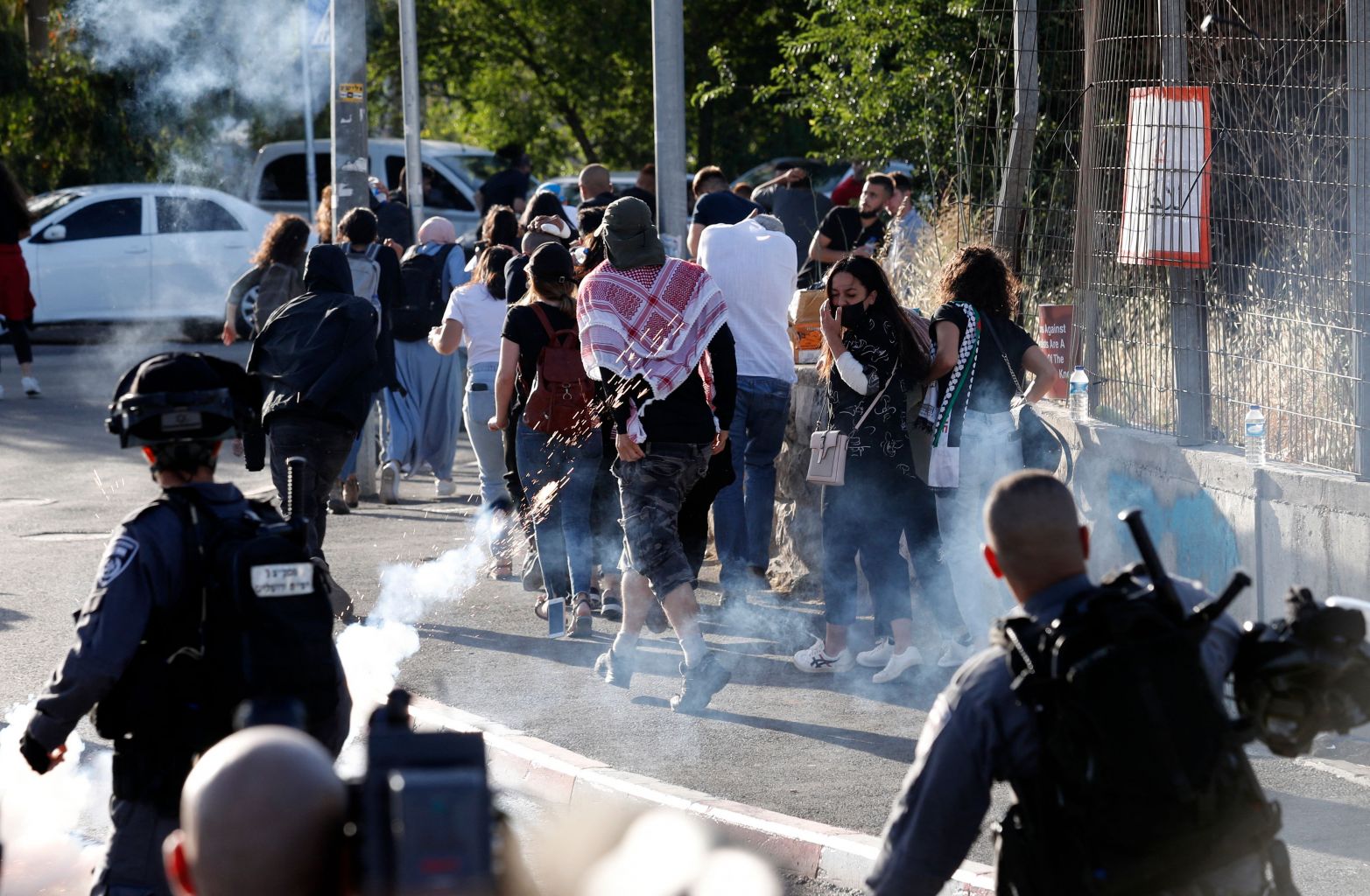 Israeli security forces fire tear gas as Palestinian protesters and activists flee, near the Sheikh Jarrah neighbourhood in east Jerusalem, on May 29, 2021.