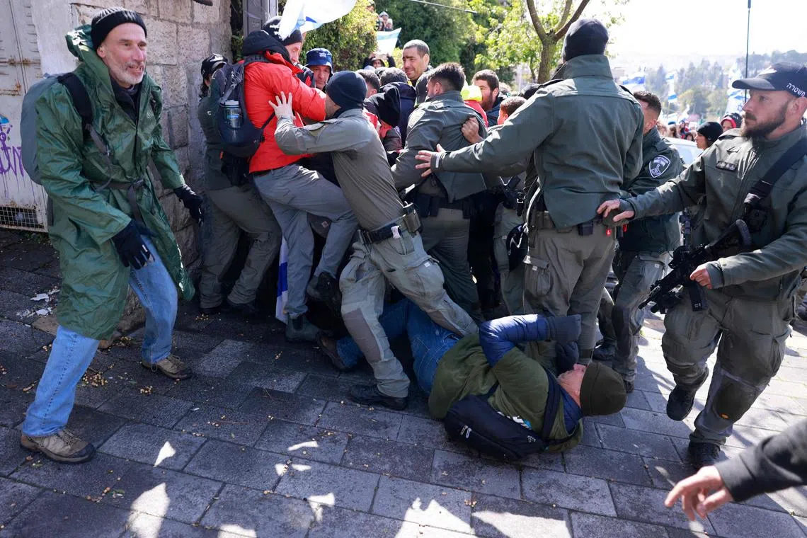 Israeli protesters scuffling with the police outside Israeli Prime Minister Benjamin Netanyahu’s Jerusalem home on March 20.