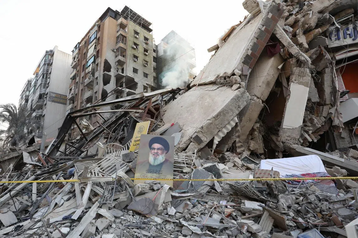 A poster of the late Hezbollah leader Hassan Nasrallah is placed on the rubble of a building that was pummelled during an Israeli air strike.
