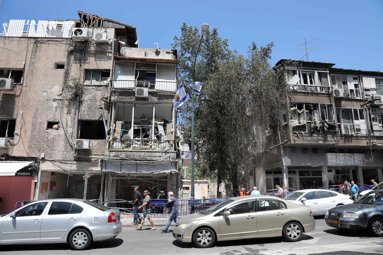People walk past damaged buildings in Ramat Gan near the coastal city of Tel Aviv, on May 16, 2021.