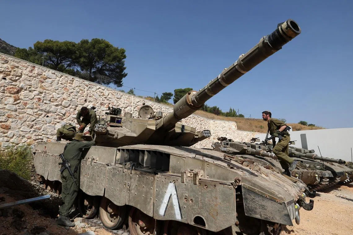 Israeli soldiers and armoured vehicles at a position along the Israel-Lebanon border, on Oct 22.