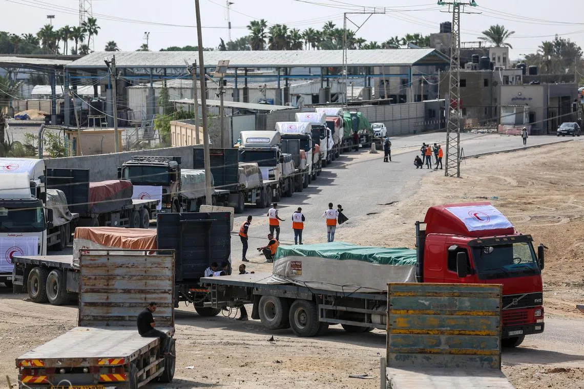 Humanitarian aid arriving through the Rafah land crossing into the Gaza Strip on Oct 21.