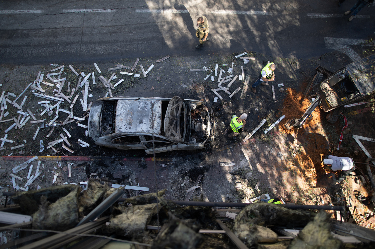 Israeli security forces and emergency services work at a site hit by a rocket fired from the Gaza Strip near Tel Aviv, on May 15, 2021.