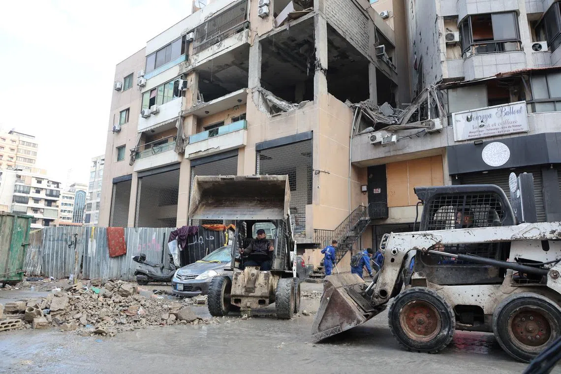 Workers clearing rubble in the aftermath of what security sources said was an Israeli drone strike in Beirut’s southern suburbs of Dahiyeh, Lebanon, on Jan 3.
