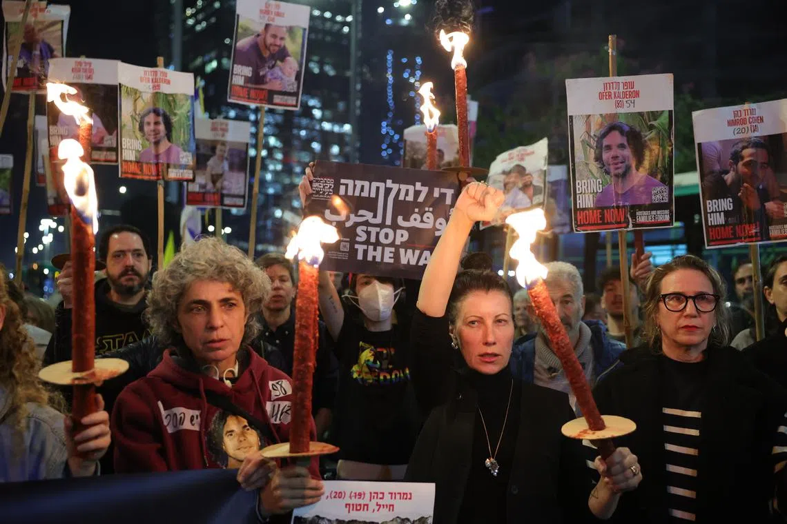 Family members of hostages held by Hamas in Gaza and their supporters lighting torches as they reacted to ceasefire reports outside the Likud party headquarters in Tel Aviv, Israel, on Jan 15.
