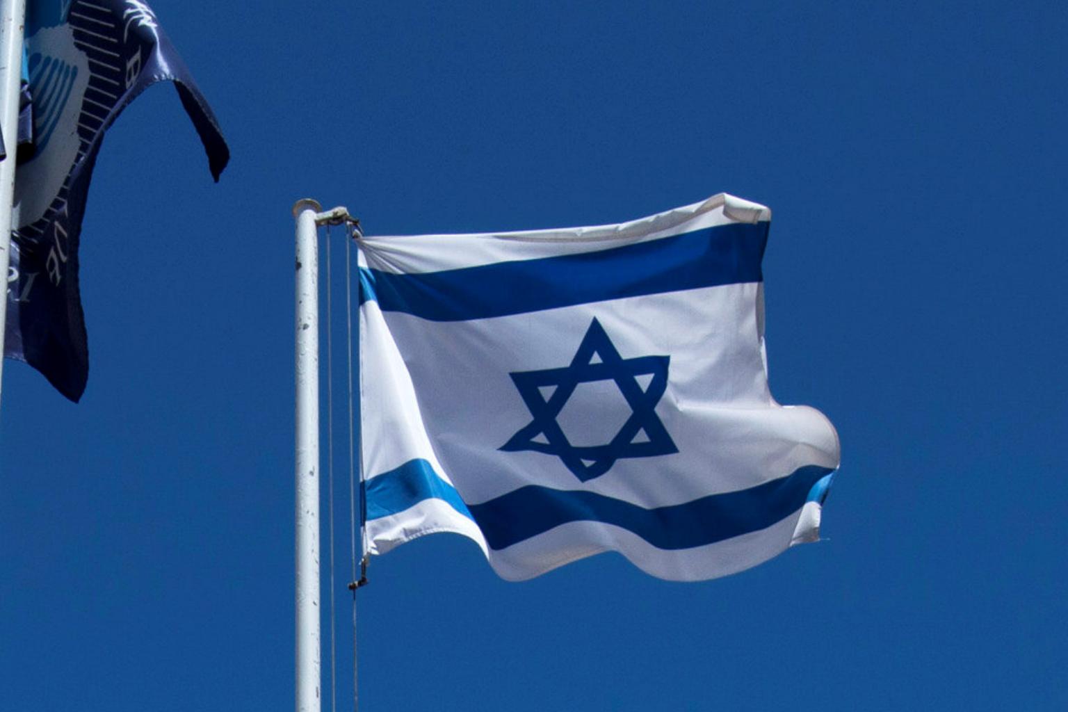 An Israeli flag flutters outside the Bank of Israel building in Jerusalem.