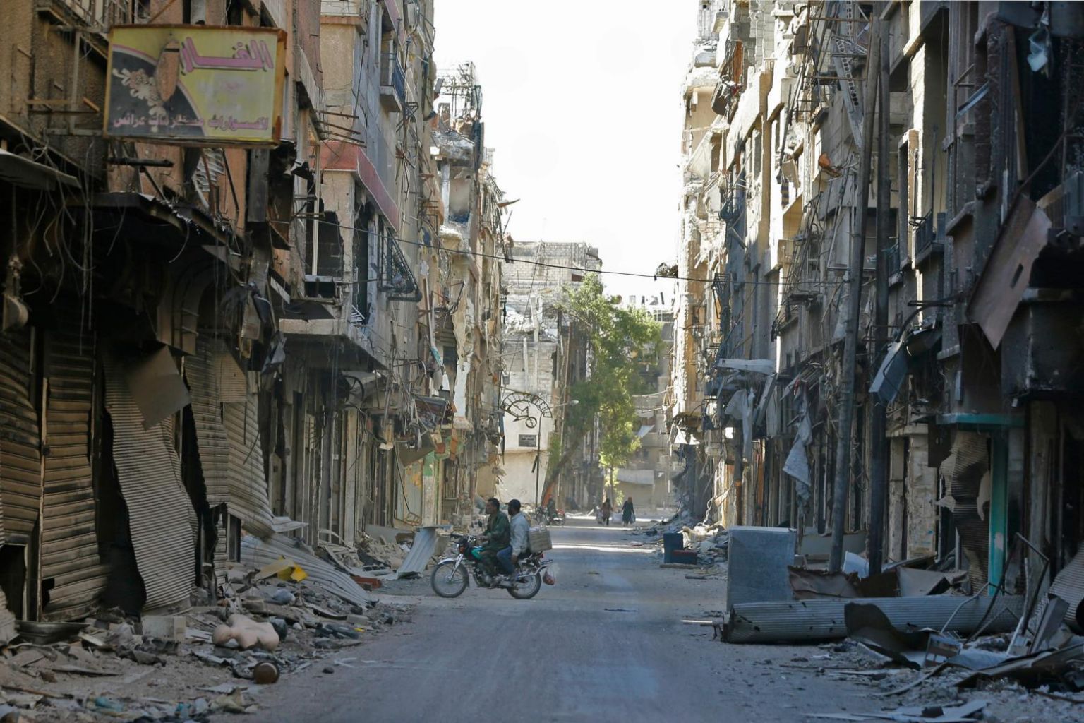People ride past destroyed buildings in the Palestinian camp of Yarmuk, southern Damascus, on Nov 1, 2018.