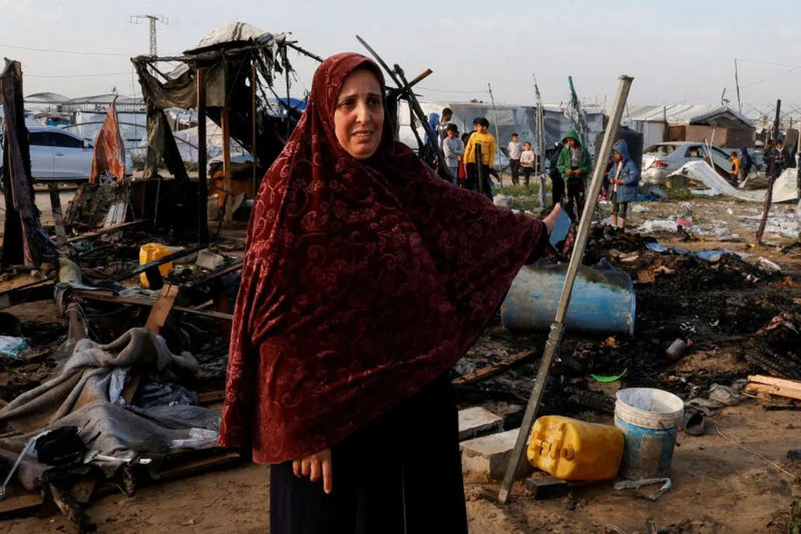 A Palestinian woman gestures as people inspect the site of an Israeli strike on a tent camp housing displaced people, in Al-Mawasi area, in Khan Younis.