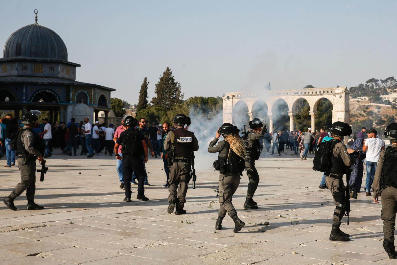 Tear-gas fumes are seen in the Haram al-Sharif compound, as Israeli security forces disperse Palestinians who entered the complex, in the old city of Jerusalem on July 27, 2017.