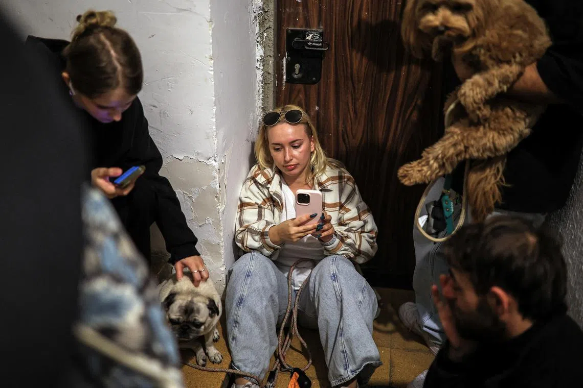 People taking cover in the stairway of a building while sirens sound in Tel Aviv, on Jan 18.