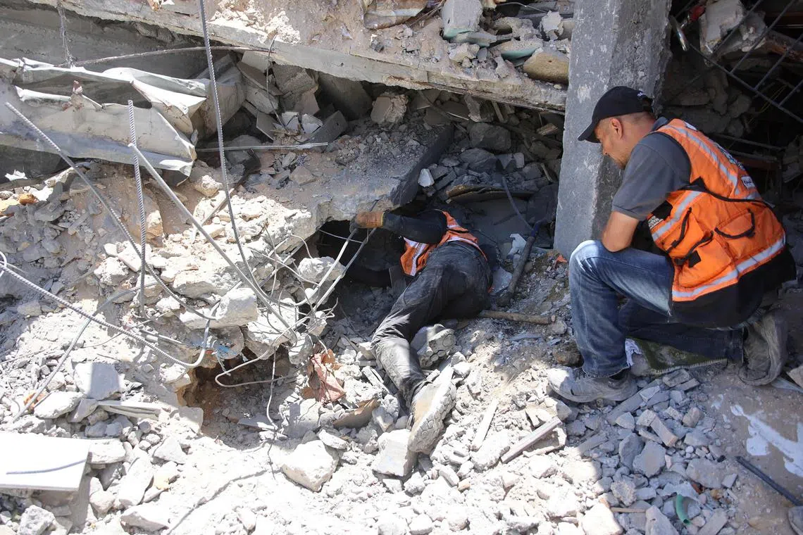 Rescuers search through the rubble of a Jabalia refugee camp building on June 1, after it was hit in an Israeli strike.