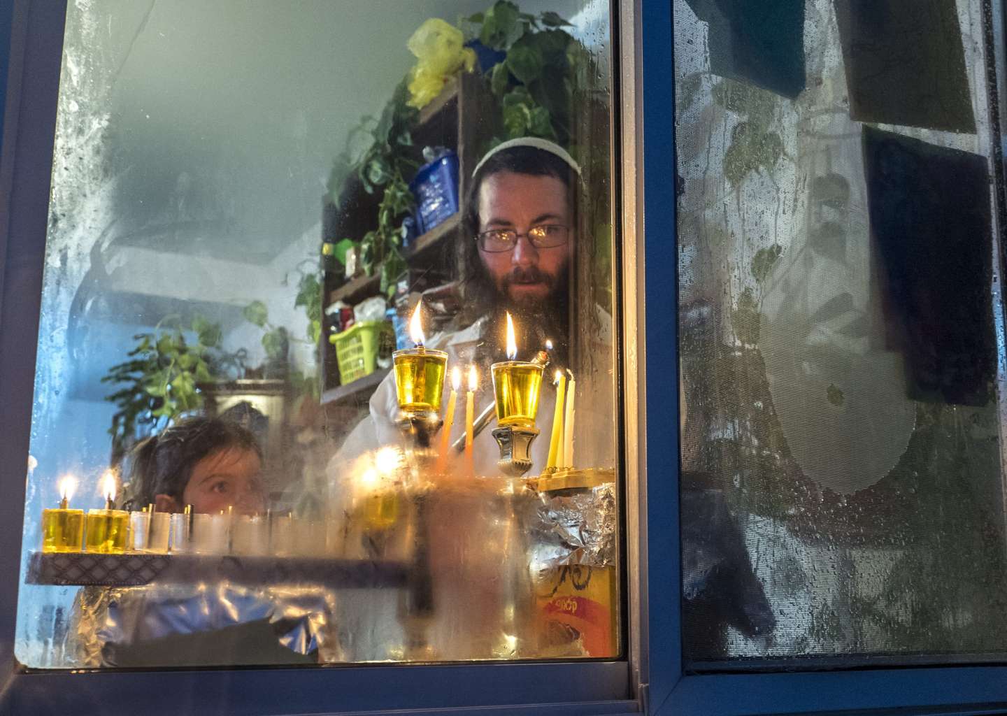 Members of the Berko family inside their home in Amona, an 'outpost' Jewish settlement in the West Bank, on Dec 25, 2016 as they light Hanukkah candles during a rain storm.