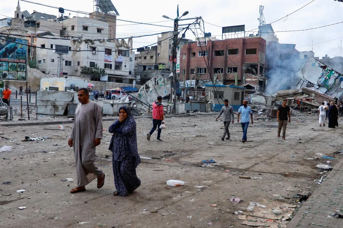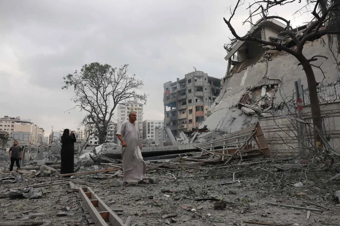 Palestinians walking near buildings destroyed in the aftermath of Israeli strikes, in Khan Younis, southern Gaza Strip, on Oct 10, 2023.