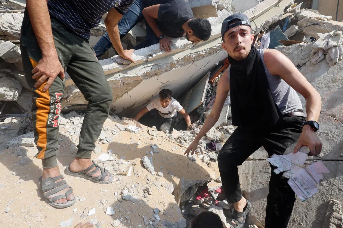 Palestinians at the site of an Israeli strike on a house in Khan Younis, in the southern Gaza Strip, on Oct 24.