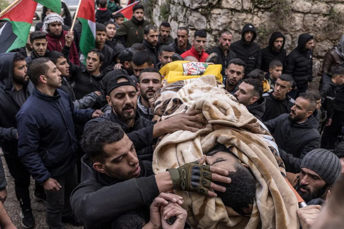Palestinian mourners carrying a body during the funeral procession of Ahmed and Jalal Jabarin, who were shot dead by Israeli troops when their car broke at a checkpoint near the city of Hebron, in the southern West Bank village of Sair, on Jan 15.