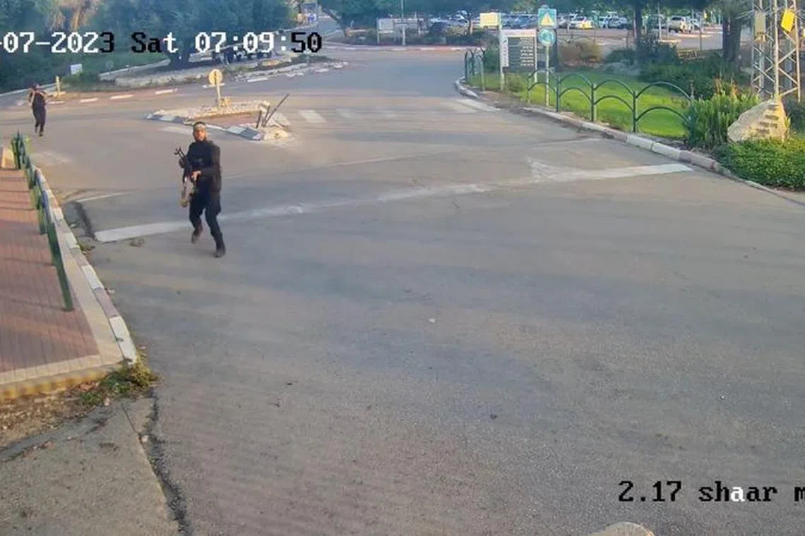 An armed man runs while aiming his gun during Hamas's Oct 7 attack, in a screen grab of footage from a surveillance camera.