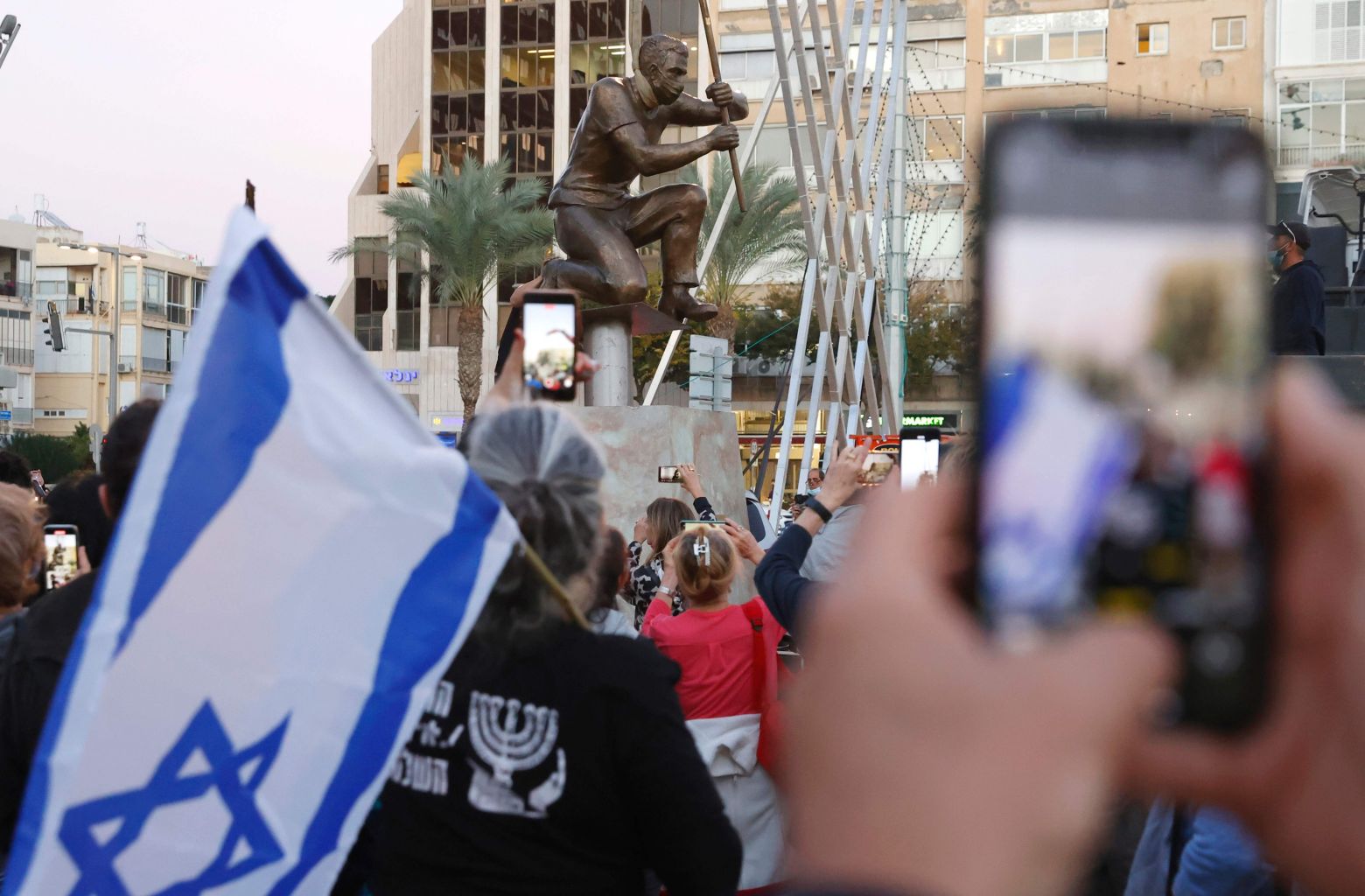 A statue of an Israeli anti-government protester is erected in Tel Aviv on Dec 10, 2020,