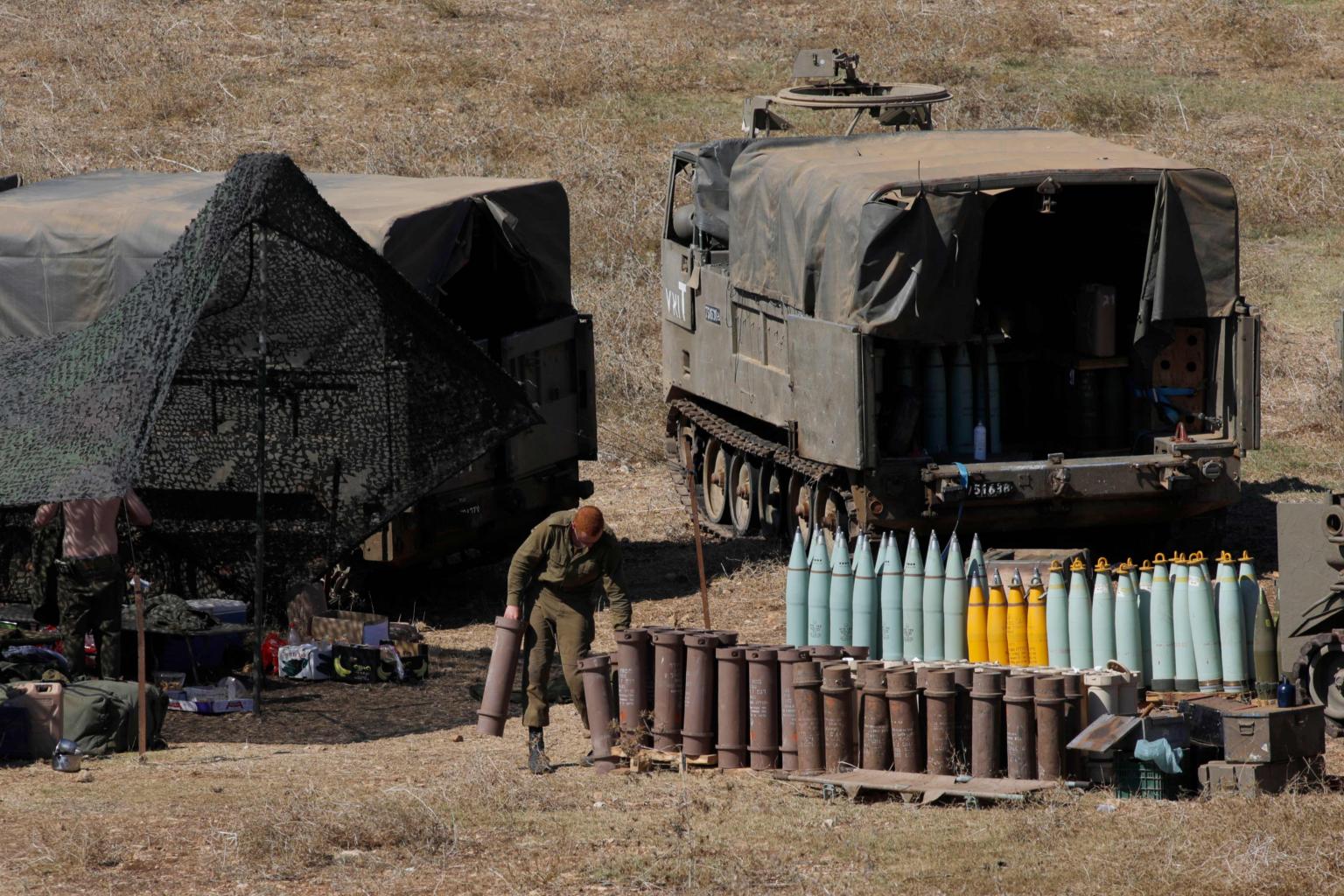 Israeli soldiers gather next to 155 mm self-propelled howitzers in northern Israel near the border with Lebanon on Aug 26, 2020.