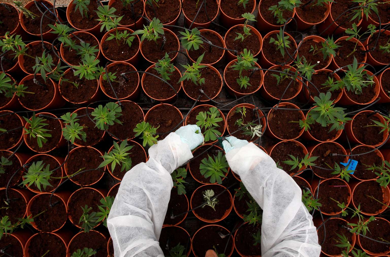 A worker tends to cannabis plants at a medical marijuana plantation near the northern Israeli city of Safed on June 11, 2012.