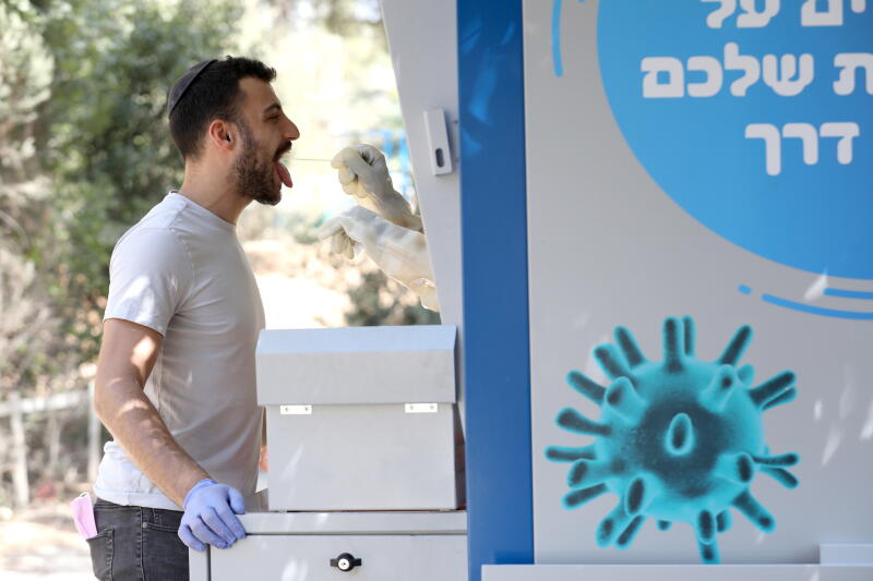 A man gives a Covid-19 swab sample at a test station in Jerusalem, on Sept 13, 2020.