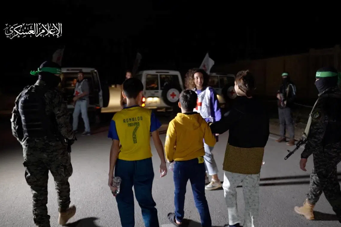 Hostages, who were abducted by Hamas gunmen during the Oct 7 attack on Israel, being handed over to members of the International Red Cross as part of a deal between Hamas and Israel.