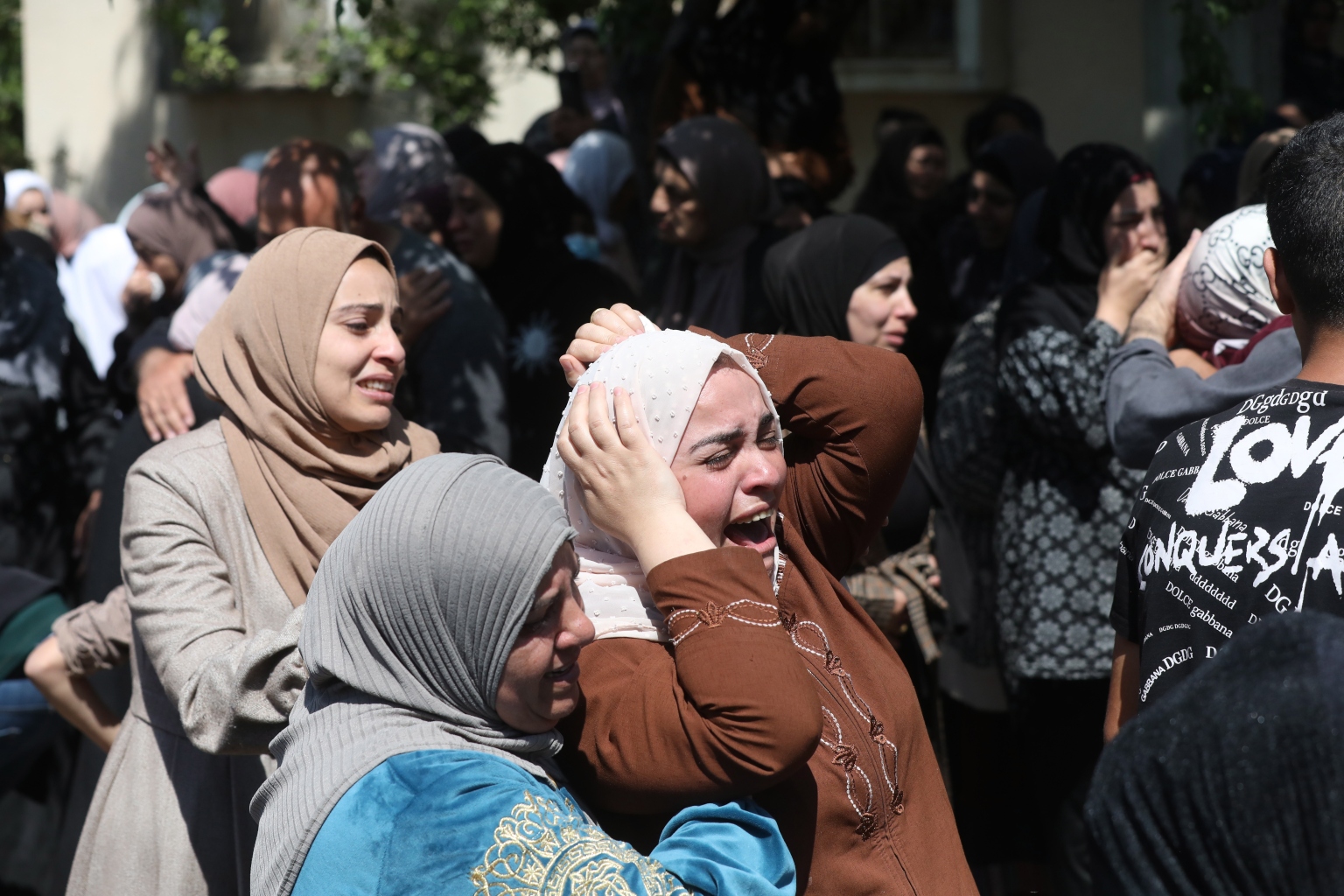 Relatives of Palestinian lawyer Mohamed Assaf mourning during his funeral at Kafr Laqif village in the West Bank on April 13, 2022.