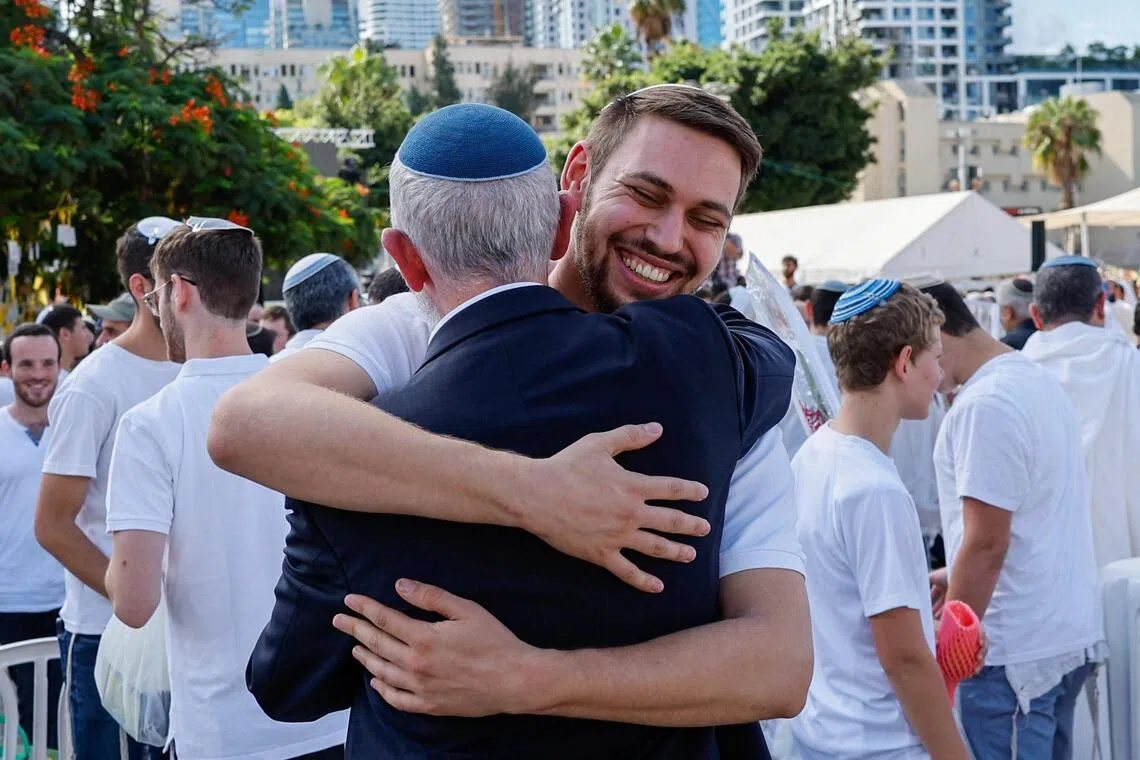 Israeli worshippers celebrate the Jewish holiday of Sukkot at “Hostages Square” in Tel Aviv after Israel’s government ratified a ceasefire with Hamas.