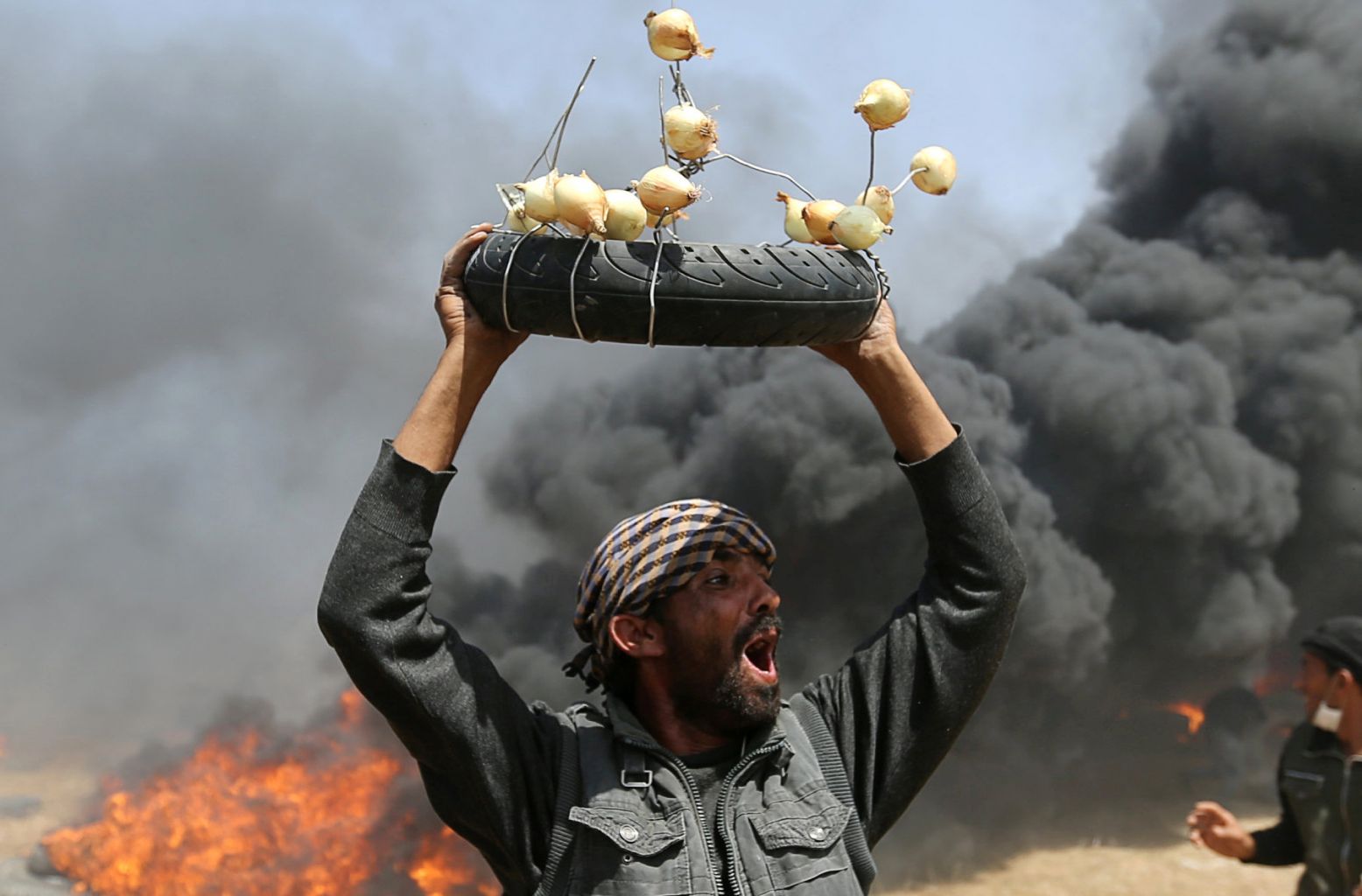 A Palestinian demonstrator shouts as he carries a tyre with onions during clashes with Israeli troops, April 6, 2018.