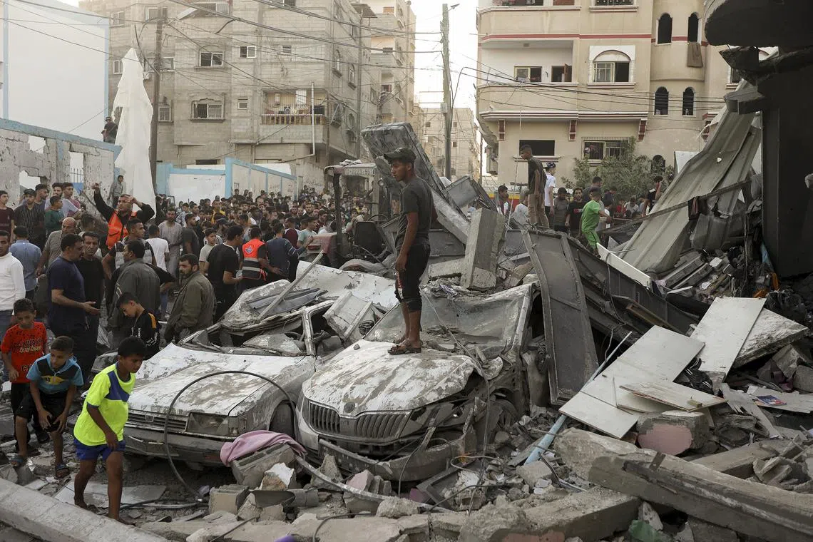 Palestinians inspect damage caused by Israeli air strikes in Khan Younis, southern Gaza.