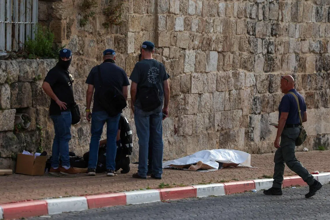 Israeli police inspect the suspect’s body at the site of a reported stabbing attack in Ramla, south of Tel Aviv.