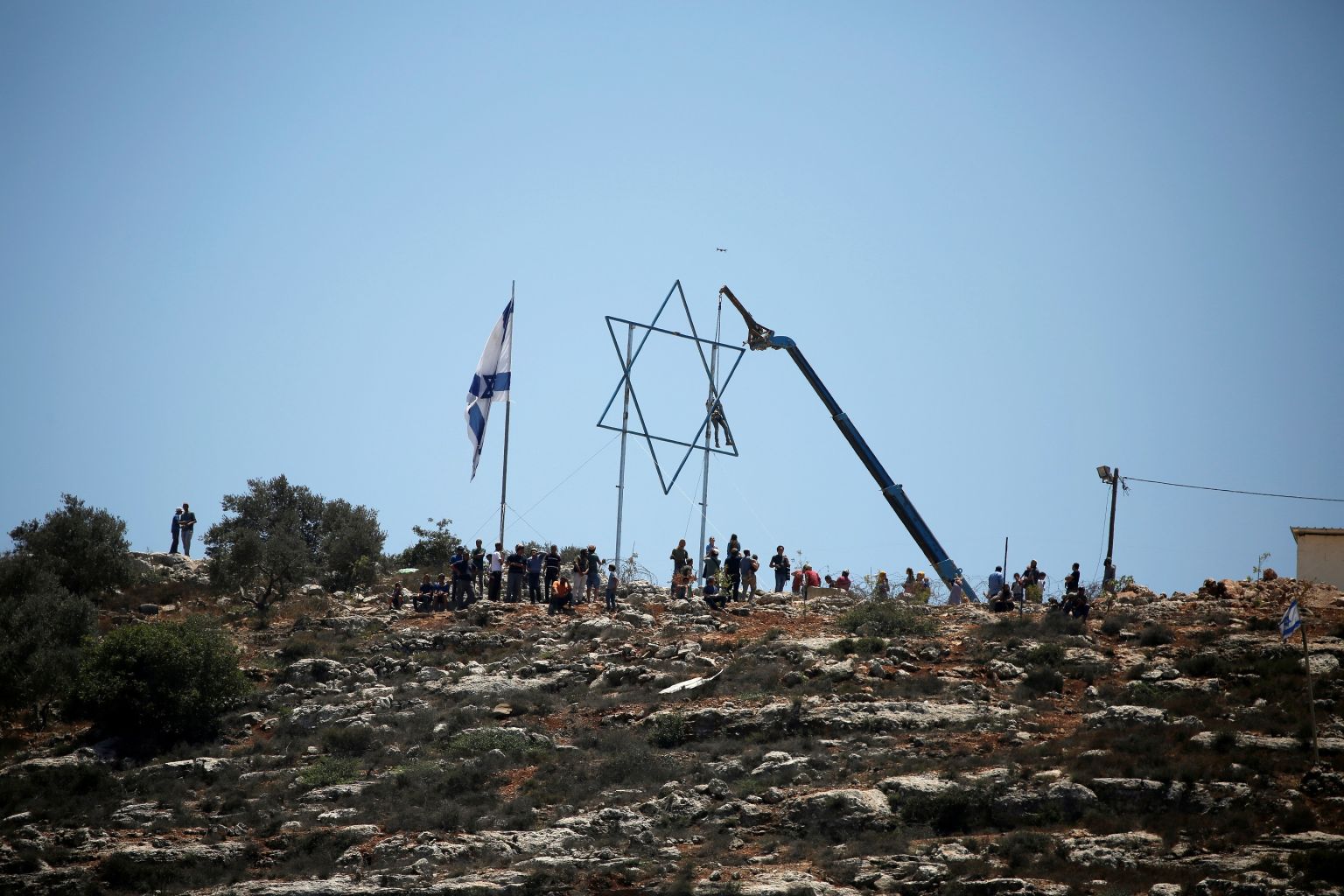 Israeli settlers erect poles with the Star of David in Evitar settlement during a protest by Palestinians against the settlements in Beita, in the Israeli-occupied West Bank on July 2, 2021