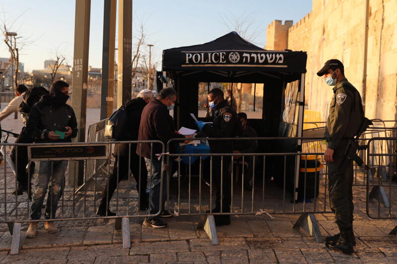 Israeli police officers manning a road block in Jerusalem, amid a full lockdown because of Covid-19, on Jan 11, 2021.