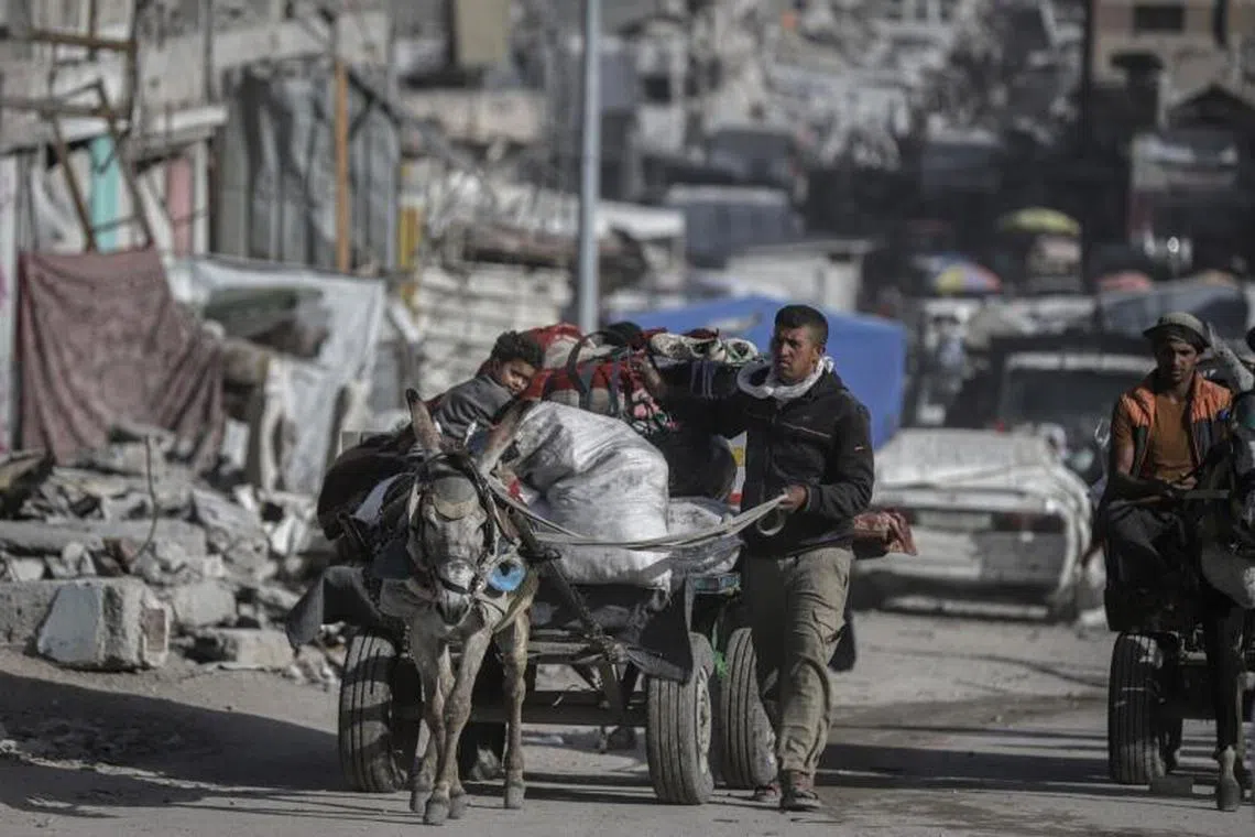 Displaced Palestinians on donkey carts flee the Shejaiya district as Israel escalated operations against Hamas, east of Gaza City, on April 3.