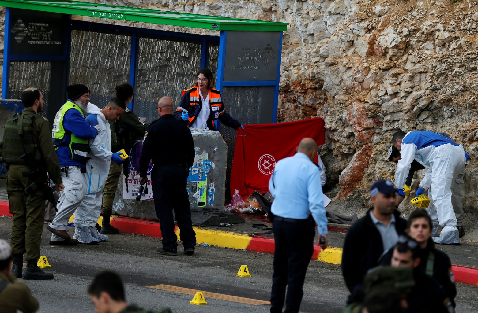 Israeli forces and medics at the scene of a shooting attack near Ramallah in the Israeli-occupied West Bank on Dec 13, 2018.