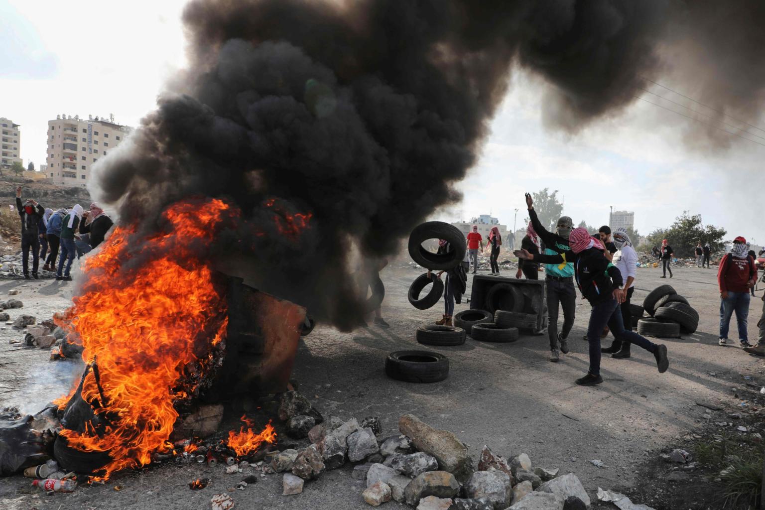 Palestinian protesters burn tires amid clashes with Israeli security forces following an anti-Israel demonstration at the entrance of the West Bank city of Ramallah near the Jewish settlement of Beit El, on Nov 16, 2019.