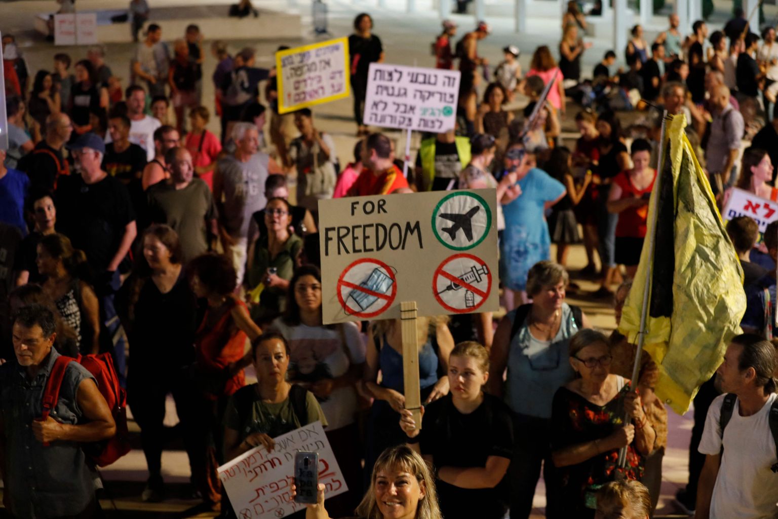 Israelis march at a rally denouncing the government's renewed restrictions to combat Covid-19, in Tel Aviv, on July 31, 2021.