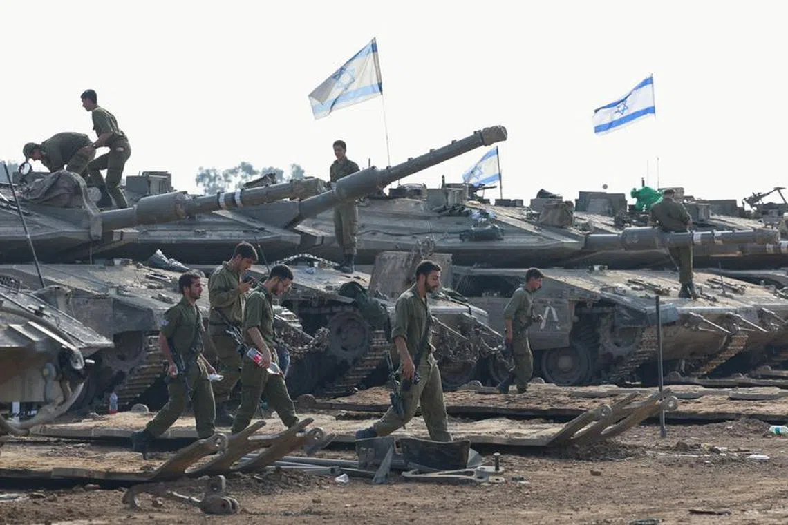 Israeli soldiers walk next to tanks near the Israel-Gaza border, in southern Israel, on Jan 1, 2024.