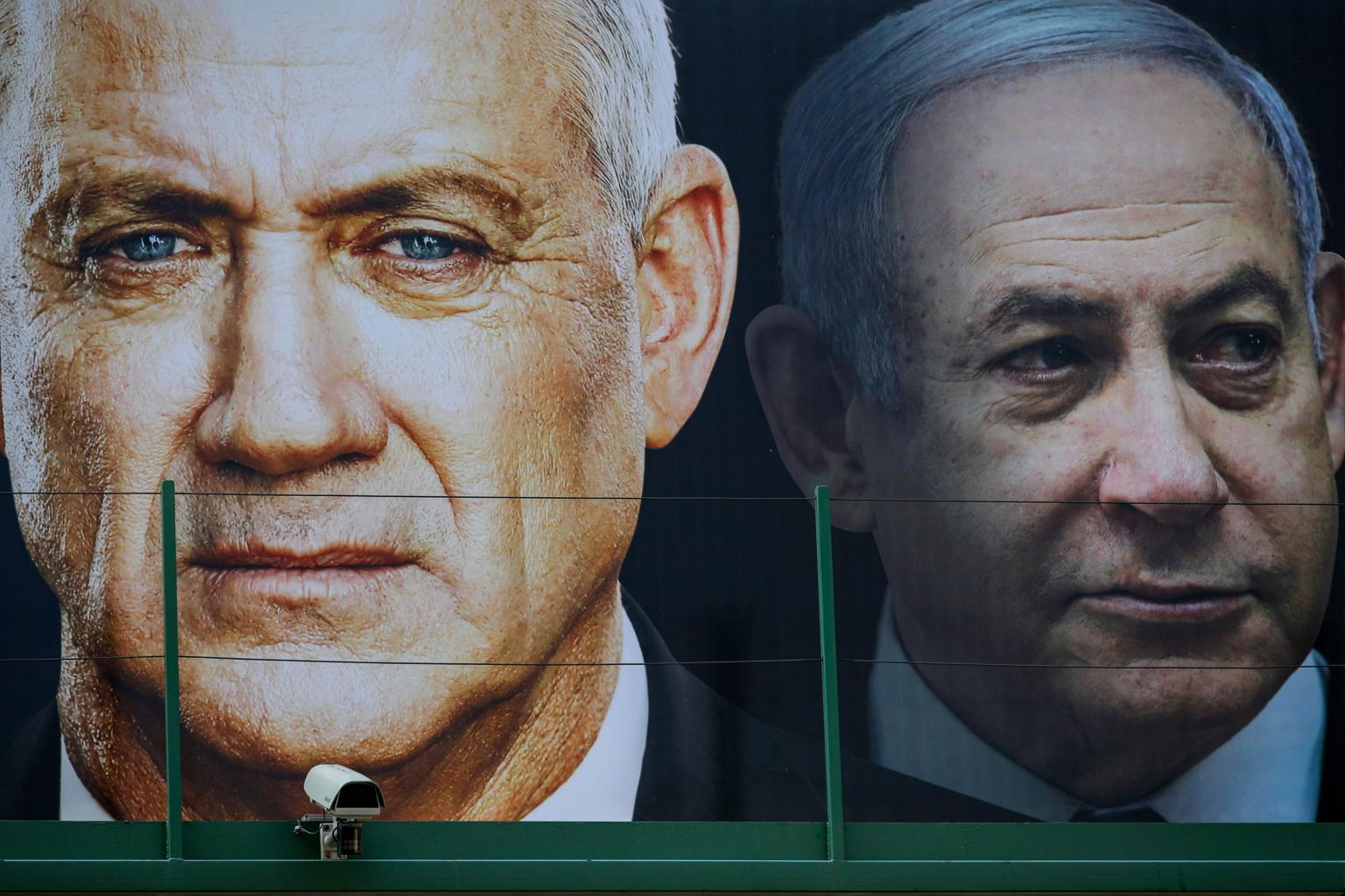 An election banner for the Israeli Blue and White political alliance with the face of its leader retired army general Benny Gantz (left) and Prime Minister Benjamin Netanyahu, in Ramat Gan, Israel, on Feb 17, 2020.