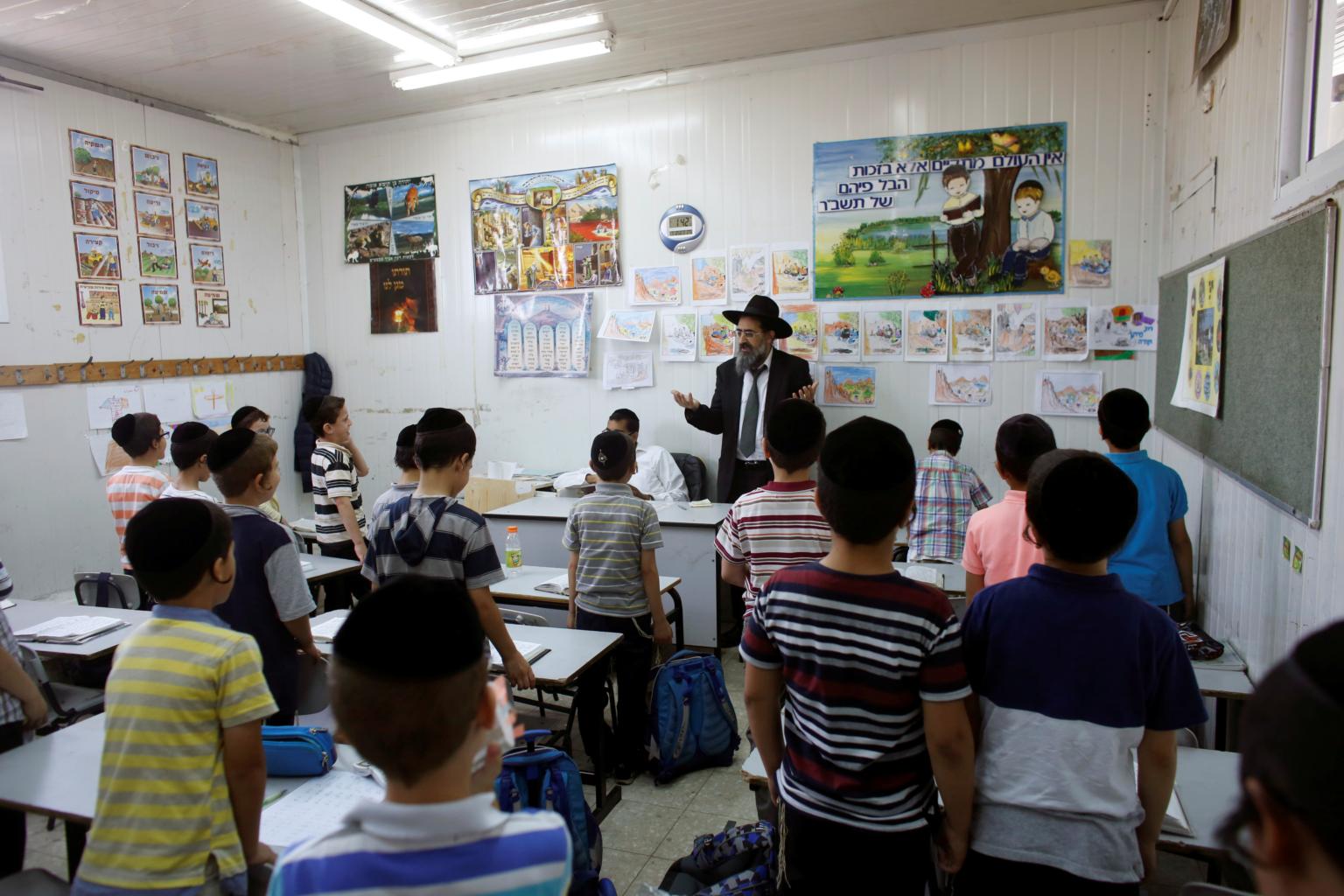 In a photo taken on July 12, 2017, Rabbi Assaf Avitan speaks to children in a classroom in the ultra-Orthodox Jewish community of Bnei Brak, near Tel Aviv, Israel.